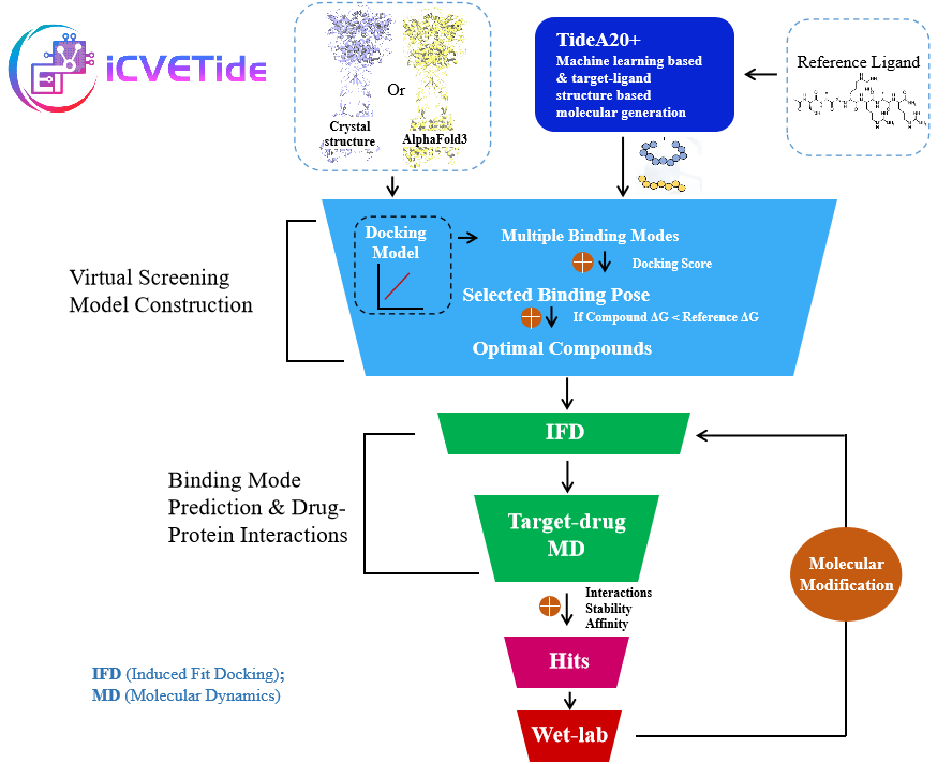 iCVETide™平台的工作流程始于靶点发现与结构解析阶段,通过PDB数据库或AlphaFold2获取高置信度的靶点三维结构,并分析关键结合位点特征。随后,AI多肽生成模块TideA20+基于靶点结构和设计需求,利用深度学习模型生成100-1000个候选多肽序列及其构象。这些候选分子进入双模式结合亲和力评估环节,通过物理打分函数(TideScore)和机器学习模型(AdTideScore)的协同作用,筛选出Top 50-100个高潜力分子。 接下来,平台对优选分子进行诱导契合对接优化,采用柔性对接算法调整多肽构象,评估结合模式变化,并筛选出20-30个优选复合物。这些优化后的结构送入分子动力学模拟与自由能计算阶段,通过100ns-1μs的动力学模拟验证结合稳定性,并利用MM/GBSA和TI/FEP方法精确计算结合自由能,最终确定10-20个最具潜力的候选分子。 在实验验证阶段,平台通过高通量固相合成快速制备高纯度多肽,并开展SPR/BLI/ITC/MST亲和力测试和细胞活性实验,必要时进行动物模型评估,最终获得1-3个经过验证的先导化合物。根据实验反馈数据,平台可自动启动迭代优化循环,持续提升设计效率与成功率。